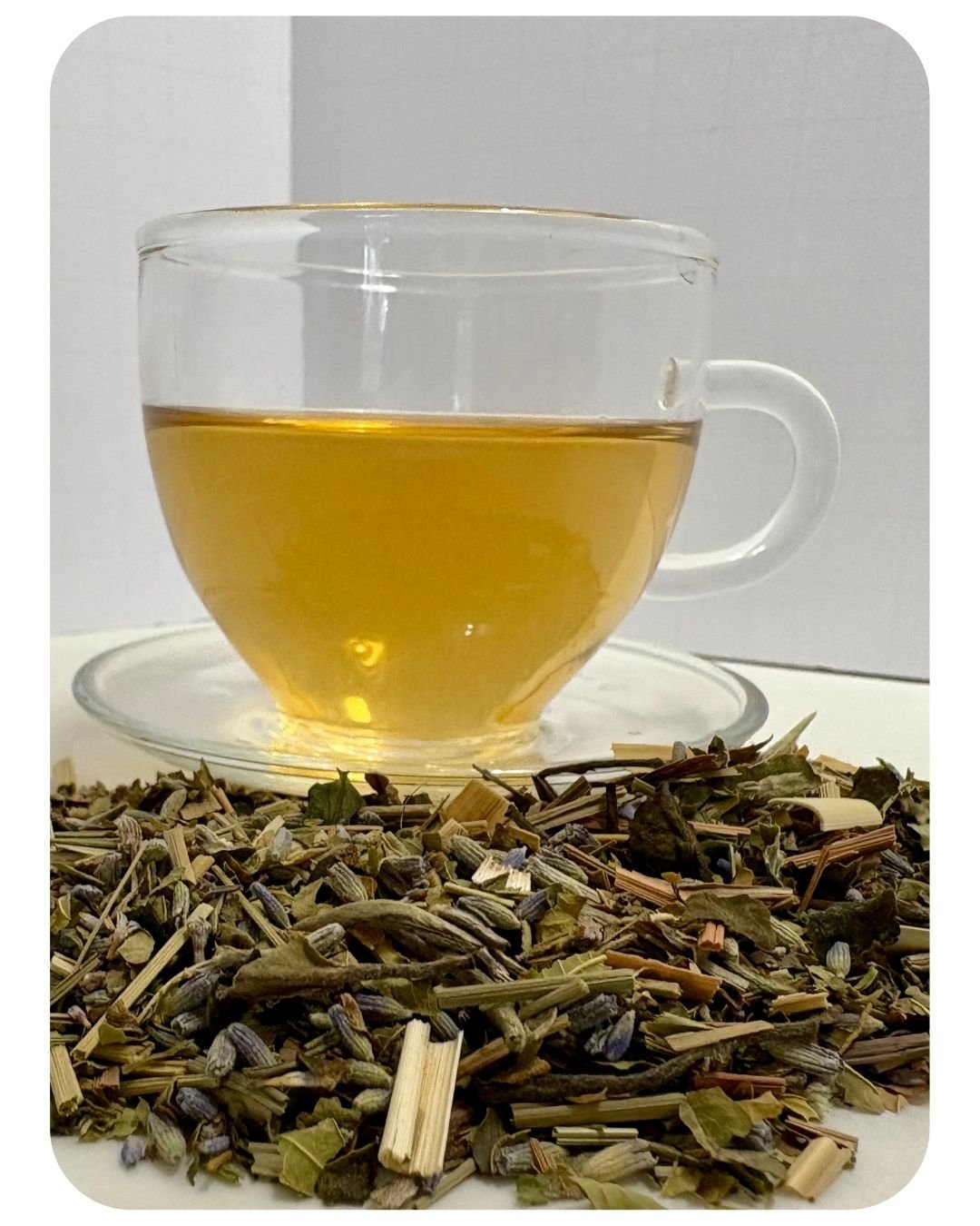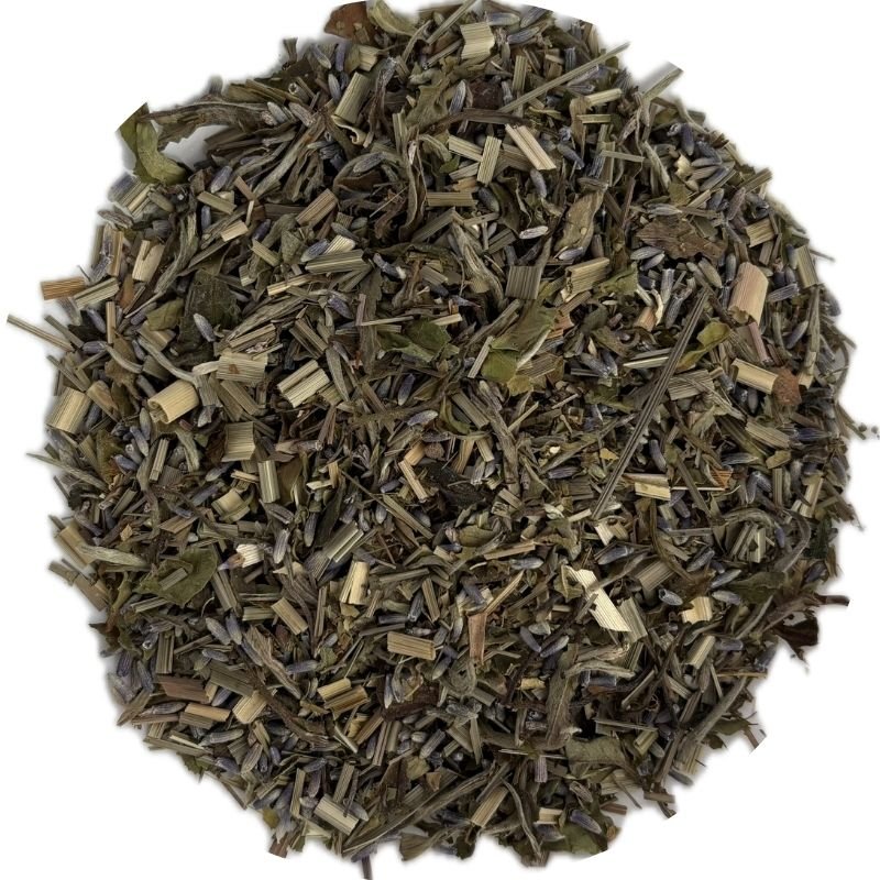 Lavender Sun loose leaf tea blend with white peony, lemongrass, lemon verbena, and lavender petals.Lavender Sun Tea