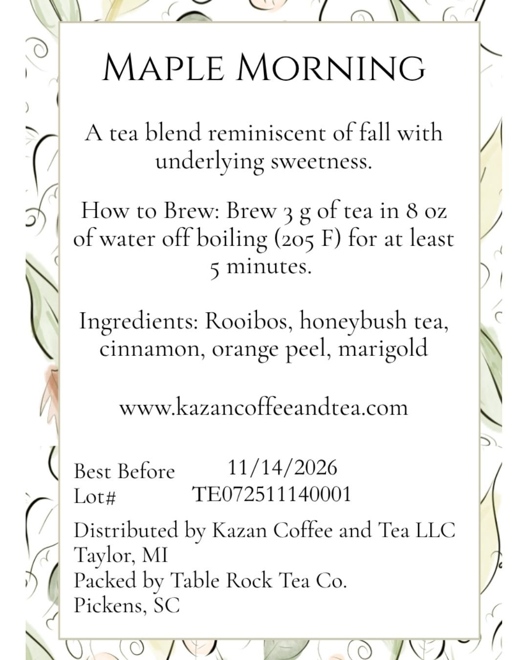 Maple Morning Tea: Rooibos, honeybush tea, cinnamon, orange peel, marigold.
